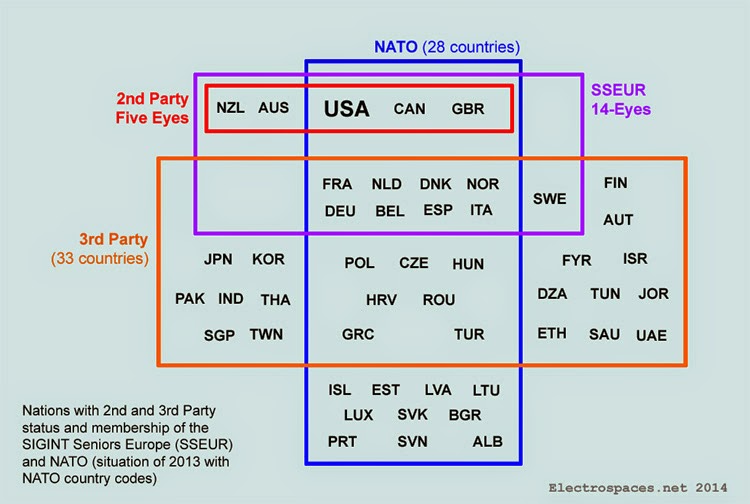 The SIGINT Seniors Europe comprise 14 countries, and when we look at their names, we see that they are identical to the nations of which The Guardian in November said they form a group called 14-Eyes.