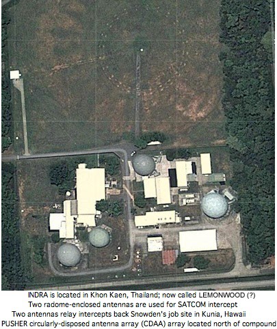 A final difference between the FORNSAT stations shown in the maps of 2002 and 2012 is the station in Thailand, which was codenamed LEMONWOOD in 2002. The location near the city of Khon Kaen was identified as being an intercept facility since 1979, but with a different codename: INDRA.